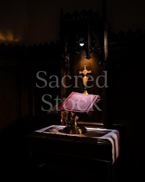 The Scriptures sit illuminated before the cross. The gilded lectern holds it up.