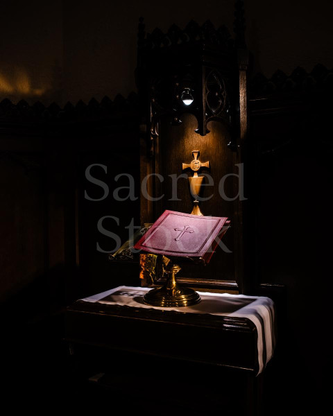 The Scriptures sit illuminated before the cross. The gilded lectern holds it up.