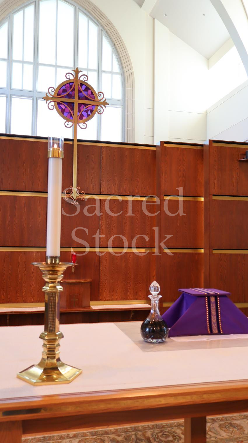 Sunlit altar with the wine, the covered consecrated bread, and candles.