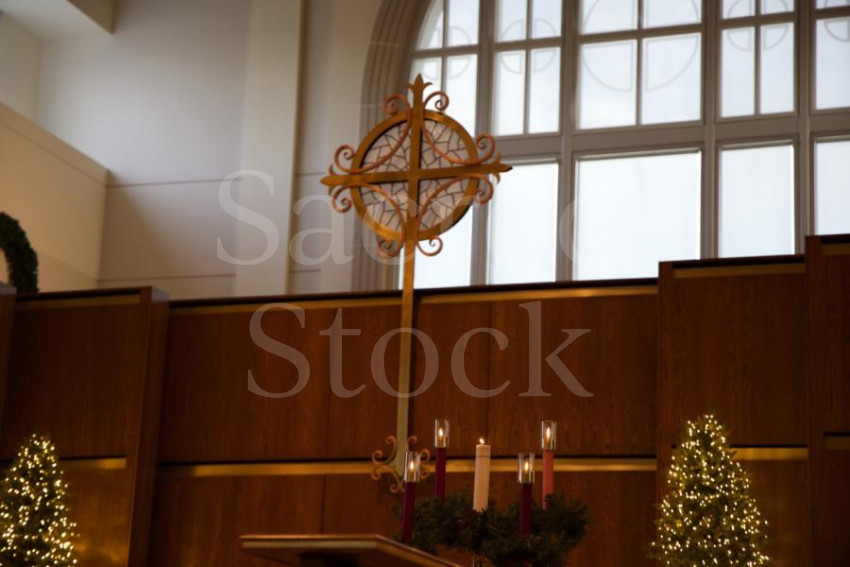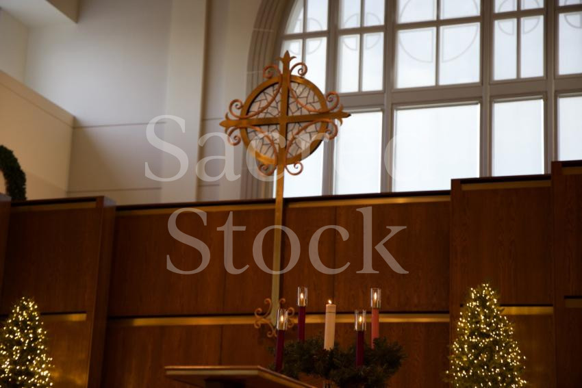 The advent wreath is fully lit while the cross stands behind. Christmas trees glow in the background.