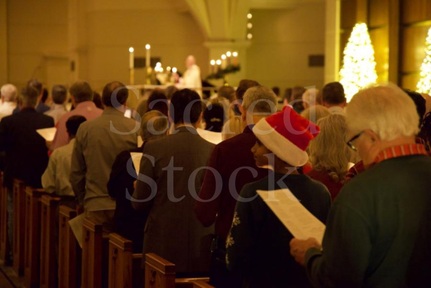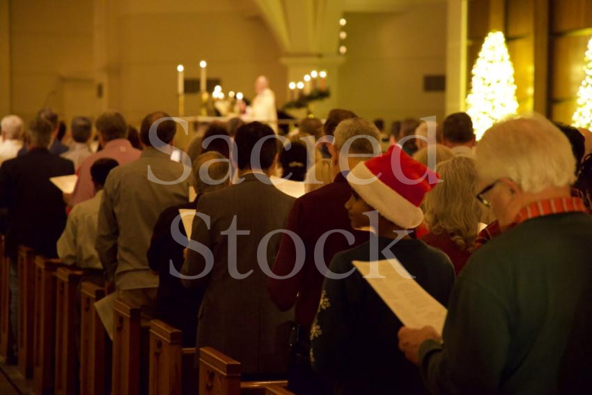 A boy stands at the end of the Christmas Eve service wearing a Santa hat.